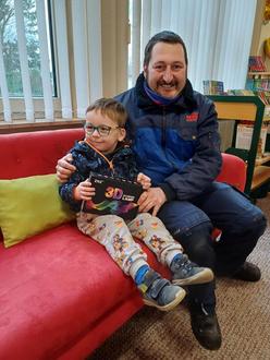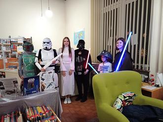 Die glücklichen Gewinner des Star Wars Day: Johann Sadowkis mit Kartenspiel, Sahra Sihombing mit ihrem Bruder und Büchereileiterin Heidi Reinig bei der Übergabe, Christopher Keßler mit Papa.