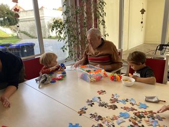 Die Senioren/innen waren sehr gespannt und freuten sich über die Abwechslung. Die Kinder brachten genügend Spiele wie Puzzle, Steck- und Fädelspiele sowie Brettspiele mit. Die Generationen verstanden sich auf Anhieb sehr gut und von Berührungsängsten gab es keine Spur. Einem Senior rührten die Kinder sogar zu Tränen, da eine schöne Erinnerung an seine Frau geweckt wurde - sie war auch Erzieherin. Nicht nur frühere Momente wurden geteilt, auch wurde den Kindern erklärt, wie man auf sein Spielzeug aufpassen und damit umgehen muss, damit es lange hält. Obst, Kekse und Getränke standen jederzeit bereit und ein entspanntes Miteinander war zu erkennen. Außerdem musizierten alle gemeinsam altbekannte Herbst- und Kinderlieder.