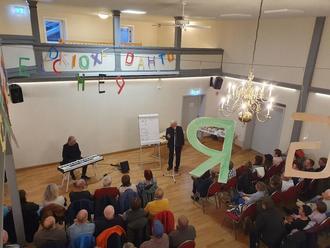 Der Kabarettist der Arche entführte die zahlreich erschienenen Zuschauer auf eine Spielwiese der Buchstaben. Er meinte:" Die deutsche Sprache sei ein Witz". Was manche nur ungern in den Mund nehmen, steckt nämlich voller Überraschungen, die Muttersprache unseres Vaterlandes. Herrlich! Manchmal dämlich, aber zum Lachen.