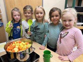 Doch das war noch nicht alles: Die Eltern brachten reichlich frisches Obst und Gemüse mit, darunter auch Kürbisse, Möhren und Kartoffeln. Gemeinsam zauberten wir daraus eine leckere Kürbissuppe. Die Kinder halfen fleissig beim Schneiden der Zutaten mit und alles wurde in einem grossen Topf gekocht. Die Kinder durften nicht nur fleissig rühren, sondern auch das Würzen übernehmen. Nach dem Pürieren war es soweit: Die selbstgemachte Kürbissuppe wurde zusammen vernascht.