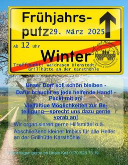 Wir laden ein zur Beteiligung am alljährlichen Frühjahrsputz in den Ortsteilen Dienstedt & Oesteröda am 29. März 2025 ab 12 Uhr.