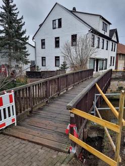 Derzeit laufen Unterhaltungsarbeiten an der Fußgängerbrücke bei der Verkaufsstelle in Niederwillingen. Die Arbeiten müssen infolge einer Brückenprüfung durchgeführt werden, um die Nutzung des Bauwerks bis zur Herstellung eines Ersatzneubaus zu gewährleisten. Die Widerlager wurden freigelegt, um die Holzträger zu trocknen, zusätzlich soll an der Wipfra noch ein Stück Geländer ergänzt werden. Die Arbeiten sind noch nicht abgeschlossen.