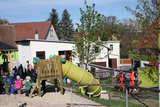 In diesem Frühjahr konnten die „Willinger Wichtel“ eine Zeit lang ihren Spielgarten nur eingeschränkt nutzen. Der Grund war sehr erfreulich, denn der Spielgarten wurde umgestaltet. Jeden Tag schauten die Kinder den Arbeitern bei ihrer Arbeit zu und konnten so den Aufbau unseres neuen Carports und der neuen Rohrrutsche verfolgen. Endlich, am 11.04.2024, war es dann soweit. Wir feiern die Spielplatzeröffnung. Im Vorfeld haben die Kinder als Dankeschön für die fleißigen Stadtarbeiter ein kleines Programm einstudiert und Bilder vom Baugeschehen gemalt. Mit lautem Jubel wurde das Band zum Spielplatz durchgeschnitten und dann gab es kein halten mehr.