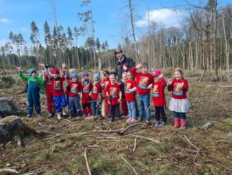 So organisierten Eltern der Bergstrolche eine Baumpflanzaktion und haben 500 Eichen und 100 Ahornbäume, gemeinsam mit ihren Eltern, sowie Herrn Buchberger vom Forstamt Frauenwald, eingepflanzt.