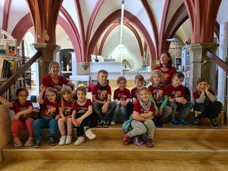Auch eine Wanderung in die Milchviehanlage nach Hammersfeld mit anschließender Traktorrückfahrt begeisterte alle Kinder. Das war ein tolles und interessantes Abenteuer. An einem anderen Piratentag fuhren wir mit dem Bus nach Stadtilm, lernten die Bibliothek kennen und die „7 Wunder“ von Stadtilm. Auch wenn das „letzte Schwein“ allen am Besten gefiel, gehört es doch nicht zu den 7 Wundern der Stadt.