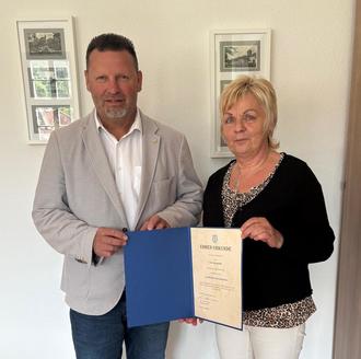 Unsere Sachbearbeiterin im Bereich Feuerwehr / Ordnungsamt Frau Ute Mocigamba, hatte am 03.06.2025 ihr 40-jähriges Dienstjubiläum. Ich gratulierte ihr herzlich und sprach meinen Dank sowie meine Anerkennung aus, verbunden mit den besten Wünschen für eine weitere gute Zusammenarbeit.