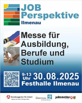 Am 30. August 2025 findet in der Festhalle Ilmenau von 9 bis 13 Uhr die Messe „JOB Perspektive Ilmenau“ statt.