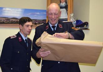 Abschied: Wehrführer Björn Mittmann übergab seinem Vorgänger Wolfgang Diller ein Geschenk der Einsatzgruppe.