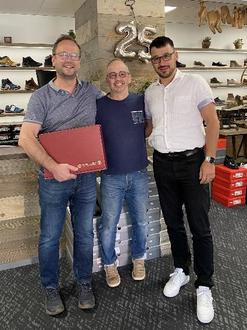 Auch das Schuhhaus Bahner feierte in 2023 ein Firmenjubiläum. Gewerbevereinsvorsitzender Torsten Hoffmann und Bürgermeister Markus Böttcher gratulieren Geschäftsinhaber Thomas Bahner zum 25-jährigen Geschäftsbetrieb.