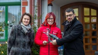 Hunderte Besucher kamen zum 29. Adventsfest vor das Steinbach-Hallenberger Rathaus. Einer der Höhepunkte des abwechslungsreichen Bühnenprogramms in weihnachtlicher Atmosphäre war die Ehrung der mehrfachen Olympiasiegerin Kati Wilhelm, nachdem sie Anfang November in die „Hall of Fame des deutschen Sports“ aufgenommen wurde. Neben der großen Ehre für Kati Wilhelm ist dies natürlich auch Bürgermeister Markus Böttcher eine besondere Auszeichnung für die sportbegeisterte Haseltalstadt und die ausgezeichnete Nachwuchsarbeit in den Vereinen, der sei man sich bewusst ist. Das Stadtoberhaupt überreichte der Ehrenbürgerin ein originelles Geschenk, welches Kunst- und Museumsschmied Falk Nothnagel entworfen hatte. Ein schmiedeeisernes Sekt-Service voller Symbolik und - in Anlehnung an Wilhelms Spitznamen - natürlich mit einer Flasche Rotkäppchensekt, welche auf zwei stilisierten Skiern liegt, zwischen zwei nach oben offenen Hufeisen für das Glück, eingerahmt von zwei Skistöcken, die gleichzeitig die hängenden Sektgläser halten.