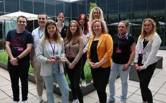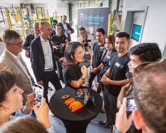 Bundesaußenministerin Annalena Baerbock im Gespräch mit Auszubildenden beim Firmenbesuch in Steinbach-Hallenberg.