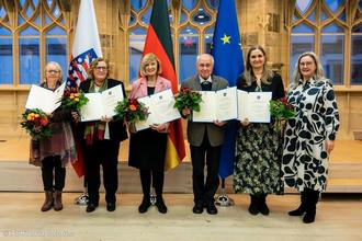 Dr. Manfred Recknagel (3. v.re.) erhielt für sein über 30-jähriges Wirken als ehrenamtlicher Handelsrichter den Ehrenbrief des Freistaats Thüringen, überreicht durch die Stiftungsratsvorsitzende der Thüringer Ehrenamtsstiftung und geschäftsführende Ministerin Heike Werner (re.)