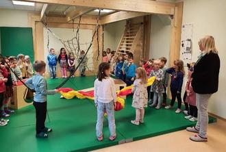 Voller Vorfreude warten die Kinder auf die Freigabe des neuen Bewegungsraumes in der Kit Haseltal.
