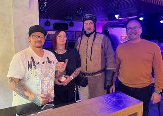 Gewerbevereinsvorsitzender Torsten Hoffmann (re.) und der Burgvogt schauten am Eröffnungstag bei Sandy Riehm und Oliver Holland-Moritz vorbei.