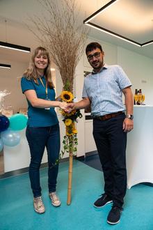 Bürgermeister Markus Böttcher beglückwünscht Tierärztin Dr. Tina Hollandt-Albrecht zur Praxiseröffnung.