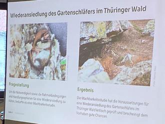 Im Zentrum der Vorträge stand die Vorstellung der Ergebnisse des bundesweiten Verbundprojekts „Spurensuche Gartenschläfer“ (2018-2024) sowie der 2024 durchgeführten Machbarkeitsstudie, die die Notwendigkeit und Machbarkeit der Freisetzung von Gartenschläfern im Thüringer Wald geprüft hat. Die Projekte zeigen: Der Gartenschläfer hat in den letzten Jahrzehnten massiv an Lebensraum verloren und kann in Thüringen fast nur noch im Schiefergebirge nachgewiesen werden. Die Art kam im Thüringer Wald vor, findet hier ideale Bedingungen und die Erfolgsaussichten für eine Ausbringung von Gartenschläfern auf bestimmten Flächen sind gut.