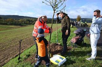 Die Gemeinde hatte alles vorbereitet, es wurden Apfelbäumchen gepflanzt. Karl hat schon einen Apfelbaum - etwas weiter unten am Bermbacher Weg. Hugo hat eine Pflaume und Arno bekam jetzt wieder einen Apfelbaum. Dreimal hat die Familie Wörzberger schon den Spaten bei solch einer Aktion in die Hand genommen. „Wir haben da drüben unseren Garten“, erzählt Mama Ellen. Und Papa Peter fügt hinzu: „Nun sind es drei Kanister Wasser, die hierher kommen.“ Ist vielleicht noch ein vierter drin? Für den Baum eines kleinen Mädchens? „Nein - drei Feuerwehrmänner reichen“, meint die Familie und schmunzelt.