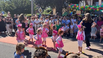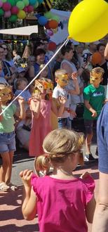 Der Nachmittag startet mit einem Willkommensgruß an alle Gäste. Mit bunten Ballons und selbstgestalteten Löwenmasken eröffneten die Kinder und das Team der Kita das Fest. „Willkommen zum Sommerfest“ und „Wir sind löwenstark“ schallte es durch die Straße und alle stimmten mit ein.