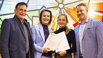 Landrätin Peggy Greiser und die Sportlerin unterzeichneten am 30. September im Steinbach-Hallenberger Rathaus einen Sponsoring-Vertrag für ein Jahr. In der Saison 2024/2025 startet die DSV-Athletin demzufolge mit dem Schriftzug „Prachtregion.de“, der auf beiden Seiten ihres Wettkampf-Stirnbandes und ihrer Wettkampf-Mütze prangen wird.