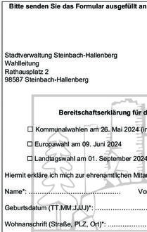 Sind Sie bereit, sich aktiv am Wahlgeschehen zu beteiligen? Dann nutzen Sie bitte das anhängende Formular (Online-Abruf unter: www.steinbach-hallenberg.de > Wahlen 2024). Sie können Ihr Interesse auch weiterhin telefonisch unter Tel. 0368473800 oder per E-Mail an wahlen@steinbach-hallenberg.de bekunden. Weitere Informationen zu den Wahlen 2024 finden Sie unter www.steinbach-hallenberg.de.