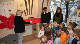 Der Meinung sind auch die übrigen Mädchen und Jungen der Steinbach-Hallenberger Kindertagesstätte „Haseltal“. Die neue Spielwelt „Storchennest“ bietet den Kindern alle Möglichkeiten für spannende Entdeckertouren. Kletterwege führen in verschiedene Häuschen, Höhlen und Türme. Genauso gibt es kuschelige Rückzugsräume. Die bieten Geborgenheit und beinhalten unterschiedliche Materialien, Oberflächen und Details. Ebenfalls dazu gehört auch ein neuer Kaufladen, mit dem man spielerisch in die Rolle eines Waffelbäckers oder eines Verkäufers schlüpfen kann. Schräg gegenüber befindet sich die Puppenstube mit Schränken und Wickelutensilien. Hier versorgen die Puppeneltern ihre Puppenkinder. Und auch einen Verkleidungsstand gibt es im neuen Rollenspielraum.