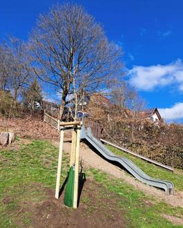 Auch an anderen Stellen im Stadtgebiet wurden Bäume ergänzt. Auf dem hinteren Spielplatzbereich der Kita „Haseltal“ wurde eine Weiß-Esche als Ersatz für die im letzten Jahr entfernte Weide gepflanzt. Im kleinen Park am Bahnhof ersetzt eine neue Fleischrote Rosskastanie einen Baum, der vor einigen Jahren entfernt werden musste. Eine Wiederbepflanzung am Hang, dem ursprünglichen Standort des vorherigen Baumes, erwies sich als nicht sinnvoll.