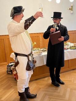 Dem Anlass entsprechend stießen im standes- und zeitgemäßen Outfit und gemeinsam mit 70 Gästen Burgvogt und Bürgermeister auf die neue Ausstellung im Rathaussaal an.