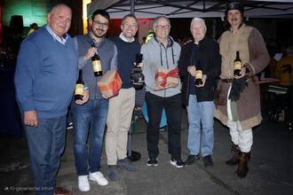 Bürgermeister Markus Böttcher (2.v.li.) und Burgvogt Stephan Herwig (re.) gratulierten Bürgermeister und Vereinsvorsitzenden Steffen Bonk (3.v.li.) zum 25-jährige Jubiläum und überreichten ihm und dem Vereinsvorstand die beliebten Steinbach-Hallenberger Gastgeschenke.