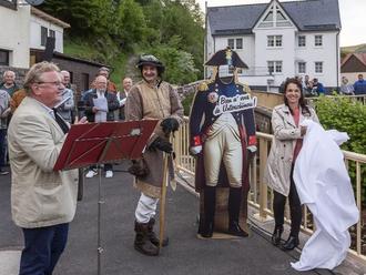 Projektinitiator Wolfram König, Burgvogt Stephan Herwig und Janine Holz, Leiterin der städtischen Touristinformation, enthüllen die Napoleonfigur mit ausgeschnittenem Kopfloch.