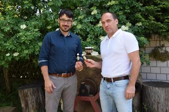 Bereits seit Wochen wird in der Steinbach-Hallenberger Hallenburgstraße an einem besonderen Tröpfchen getüftelt. Lars Kreuzer, der für seine speziellen Fruchtliköre bekannt ist, hat anlässlich des 12. Burgfestes einen neuen Holler-Likör kreiert. „Es ist mit 15 beziehungsweise 28 Prozent ein etwas stärkerer Likör mit wenig Zucker und viel Holunderblütengeschmack“, erläuterte der Hobby-Likörproduzent, der in seinem Online-Shop bereits eine beachtliche Anzahl an verschiedenen Fruchtlikören im Sortiment hat. Bürgermeister Markus Böttcher und Burgvogt Stephan Herwig durften als Vorkoster und Kritiker bereits in der frühen Phase der Entstehung mit dabei sein. „Sehr lecker und perfekt, um auf das Burgfest anzustoßen“, waren sich die beiden einig. Das Etikett für das spezielle Tröpfchen wurde angelehnt an das Corporate Design zum 12. Burgfest gestaltet und zeigt neben herrlichen Holunderblüten die Ruine Hallenburg. „Von jedem verkauften Fläschchen gehen 10 Cent als Spende für den Erhalt der Burg“, informierte Lars Kreuzer. Der Hallenburg-Holler ist in den beiden Sorten „För Züje“ - mundartlich für die Dame und „Förr Örrn“ - für den Herrn - erhältlich. Die erste Charge des Hollers wird derzeit verfüllt und etikettiert. Freudestrahlend nahm Bürgermeister Markus Böttcher die erste Lieferung persönlich entgegen. „Ich habe mir passend zu unserem Hallenburgbrot, dem Hallenburgbier und den Krügen schon immer noch einen Schnaps gewünscht“ sagte Bürgermeister Markus Böttcher. Ganz besonders freue es ihn deshalb auch persönlich, dass dieser nun direkt in Steinbach-Hallenberg produziert werde und zudem dem Erhalt der Burgruine zu Gute komme. In Vorfreude auf das 12. Burgfest haben Bürgermeister Markus Böttcher und Lars Kreuzer mit einem lauten „Es lebe die Burg“ am Mittwoch mit den ersten fertigen Fläschchen vor dem Holunderstrauch im Heimathofgarten angestoßen.