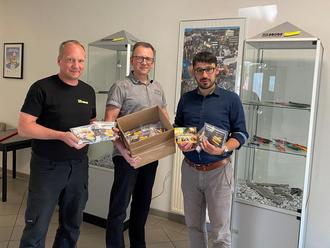 SWM-Schmiedeleiter Sven Kettner und sein Kollege, der Leiter der mechanischen Fertigung, Enrico Danz überreichten Bürgermeister Markus Böttcher den ersten Karton mit der Hallenburg-Zange.