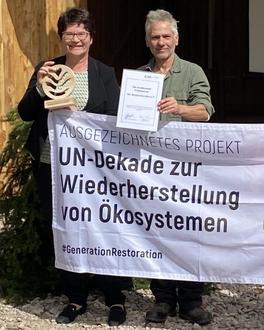 Sabine Riewenherm, Präsidentin des Bundesamtes für Naturschutz, überreichte im „Zukunftswald“ die hohe Auszeichnung als UN-Dekade-Projekt an Stephen Wehner, den geschäftsführenden Vorstand des Bergwaldprojektvereins. Damit wird die über 30-jährige engagierte Leistung von Ehrenamtlern und Freiwilligen zum Erhalt und der Wiederherstellung von Wäldern und Mooren gewürdigt.