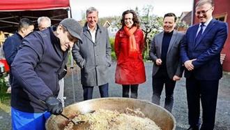 Stiftungschef Sattarov Odiljon, Jan Scheftlein (stellv. Hauptgeschäftsführer IHK Südthüringen), Vizelandrätin Susanne Reum und Wirtschaftsstaatsekretär Carsten Feller (v.re.) schauen interessiert bei der Zubereitung des usbekischen Nationalgerichtes Plov zu.