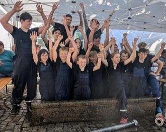 Willkommene Abkühlung nach erfolgreicher Arbeit - die Jugendfeuerwehr von Herges-Hallenberg gewinnt bei sommerlichen Temperaturen den Bürgerfestpokal im Löschangriff und hat sich daher das Bad im Brunnen redlich verdient.