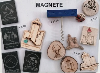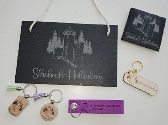 Die Mitarbeiter*innen der Touristinfo Steinbach-Hallenberg legen bei der Auswahl von Souvenirs und Geschenkartikeln großen Wert auf Regionalität und Qualität. Seit kurzem gehören auch Produkte der Firma KNCP Designs Oberschönau dazu. Ob Magnete und Untersetzer aus Schiefer oder Schlüsselanhänger mit dem Motiv der Hallenburg - die besonderen Produkte kommen bei Einheimischen wie Urlaubern gleichermaßen gut an.