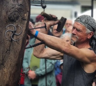 Das Einschlagen individuell gefertigter Nägel in den Nagelbaum bildete den Abschluss des Schmiedetreffens.