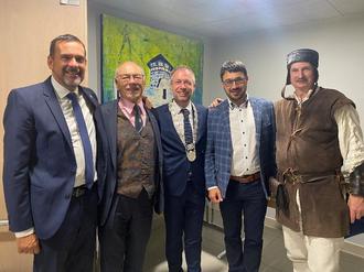 Zahlreiche Gäste aus Politik, Verwaltung und Stadtgesellschaft waren der Einladung zur Amtseinführung gefolgt, darunter als Überraschungsgäste auch Bürgermeister Markus Böttcher und Burgvogt Stephan Herwig aus der Thüringer Partnerstadt. Beide reihten sich in die lange Liste der Grußwortüberbringer ein und betonten dabei die gute Städtepartnerschaft zwischen beiden Steinbachs. Burgvogt Stephan Herwig bekräftigte stolz, dass Steinbach (Taunus) zwar keinen eigenen Burgvogt habe, er, der Burgvogt, dafür aber zwei Steinbachs!
