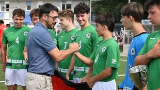 Bürgermeister Markus Böttcher gratuliert dem Team aus Deutschland zum Turniersieg.