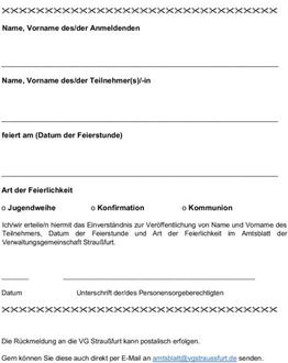 in letzter Zeit wurden wir vermehrt um die Veröffentlichung der Teilnehmerinnen und Teilnehmer der offiziellen Jugendweihen, Konfirmationen und Kommunionen im Amtsblatt gebeten. Dem kommen wir gerne nach, wenn Sie uns rechtzeitig diese beigefügte schriftliche Einverständniserklärung vorlegen und den anstehenden Termin für das laufende Jahr mitteilen.