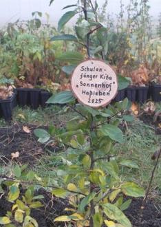 Als Erstes pflanzten wir einen Wildapfelbaum und versahen ihn mit einer kleinen Holzscheibe, worauf steht, wer ihn gepflanzt hat, damit wir später verfolgen können, wie der Baum schon gewachsen ist. Dann kamen im Wechsel verschiedene Sträucher, wie Wolliger Schneeball, Schwarzer Holunder, Kornelkirsche, Weißdorn und Kartoffelrose in die Erde. Für unsere Kinder war es ein unvergessliches Erlebnis und nachdem 30 Sträucher, darunter ein Wildapfel, eine Wildkirsche und eine Wildbirne gepflanzt waren, hatten wir uns wirklich eine Stärkung verdient und wurden mit einer Bratwurst und leckeren Getränken belohnt.
