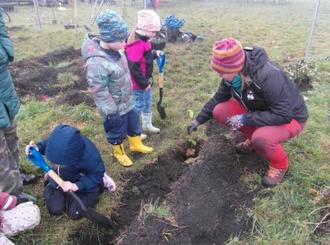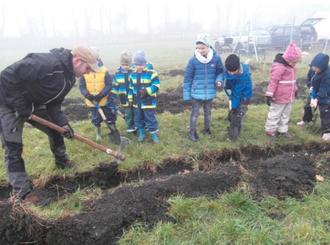 Dann war Teamarbeit angesagt. Jedes Kind suchte sich einen Partner und so ging es hochmotiviert mit den bereitgestellten Spaten an die Arbeit.