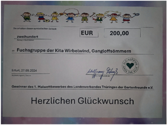 Im Rahmen des verantwortungsvollen Umgangs mit heimischen Lebensmitteln, vom Anbau bis zur Ernte, vom eigenen Garten auf den Kinderteller, hatten die Kinder der Fuchsgruppe an einem Malwettbewerb zu heimischen Gemüsesorten teilgenommen und wurden auf der Landwirtschaftsmesse „Grüne Tage“ in Erfurt zu den glücklichen Gewinnern gekürt. Die kleinen Kunstwerke wurden auf Saattütchen gedruckt und vom Landesverband der Gartenfreunde an die zahlreichen Besucher verteilt.