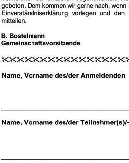 in letzter Zeit wurden wir vermehrt um die Veröffentlichung der Teilnehmerinnen und Teilnehmer der offiziellen Jugendweihen, Konfirmationen und Kommunionen im Amtsblatt gebeten. Dem kommen wir gerne nach, wenn Sie uns rechtzeitig diese beigefügte schriftliche Einverständniserklärung vorlegen und den anstehenden Termin für das laufende Jahr mitteilen.