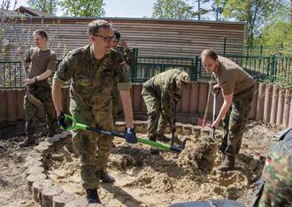 Nach den Begrüßungsworten von Bürgermeister Ringo Kraft begann der Tag mit einer kurzen Einweisung in die Örtlichkeiten und die jeweiligen Aufgaben. In zwei Gruppen aufgeteilt, machten sich die Kameradinnen und Kameraden gemeinsam mit dem Bürgermeister sowie einem Gemeindearbeiter an der Wanderhütte und in der Kita „Kirchbergzwerge“ an die Arbeit. Das Gelände rund um die neue Nurzner Wanderhütte wurde vom restlichen Baumaterial und anderen Gegenständen befreit. Der Schwerpunkt hier lag jedoch auf der Sortierung, Säuberung und Stapelung eines Ziegelsteinhaufens, dessen Steine später als Upcycling Projekt als Gehweg um die Hütte verlegt werden sollen. Zudem wurde hohes Gras gemäht, um die Umgebung aufzuwerten und für eine schönere Atmosphäre zu sorgen. Auch in der Kita wurde tatkräftig angepackt: Ein kompletter Spielbereich wurde ausgehoben, um die Vorbereitungen für den Einbau von Fallschutzmatten zu treffen. Insgesamt bewegten die Soldatinnen und Soldaten an diesem Tag innerhalb von wenigen Stunden weit über 250 Schubkarren voll Erde und Sand - eine beeindruckende Kraftaktion.