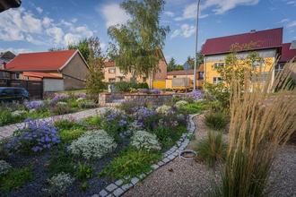 Mit Hilfe des ehemaligen Bürgermeisters, den Gemeindearbeitern und anderen engagierten Freunden und Helfern wurde in 2022 mit den Arbeiten begonnen. Aus einem ungemütlichen Platz mit Wartehäuschen entstand eine grüne Oase mit einer Rundbank zum Verweilen. Von hier kann man mehrjährige, bienenfreundliche Stauden bewundern, im Frühling auch Tulpen und Winterlinge. Dazu wurden eine Beetrose und Sommerflieder sowie eine Felsenbirne und ein Eisenholzbaum als zukünftiger Schattenspender gepflanzt.
