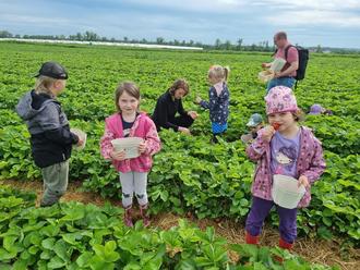 Am 27.05.2024 reiste die Vorschulgruppe unserer Kita auf den Erdbeerhof nach Gebesee. Frau Carolin Leefers berichtete viel Wissenswertes über die Erdbeere. Wir erfuhren wie genau man eine Erdbeere pflücken muss und wie lange so eine Erdbeerpflanze überhaupt Früchte trägt. Gewappnet mit Körbchen, welche uns Frau Leefers bereitstellte, ging es dann ab aufs Erdbeerfeld. Wir konnten in Windeseile unsere Körbchen füllen und bekamen sie als Geschenk mit in die Kita. Die leckeren Erdbeeren verteilten wir dann zum Naschen an alle Kinder aus der Kita. Da wir so eine große Ernte hatten, beschlossen wir, daraus einen Erdbeerquark zu zaubern, welchen wir am nächsten Tag zum Frühstück mit allen Kindern essen konnten. Zu guter Letzt spendierte uns der Erdbeerhof auch noch ein Softeis aus dem Erdbeercafe. Hiermit möchten wir von Herzen DANKE sagen für diesen super gelungenen Erdbeertag!