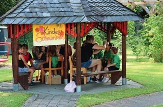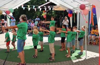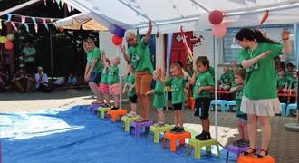 Die Mauskinder waren sprichwörtlich Fit, wie ein Turnschuh, zeigten welche Schritte und Kicks sie draufhatten und demonstrierten allen Gästen, wie gut sie schon im Schwimmen waren. Anschließend zeigten die Igelkinder, wie langweilig Handy, Tablet und Fernseher als Zeitvertreib eigentlich sind und luden alle zum Tanzen und Bewegen an der frischen Luft ein. Unsere Schulanfänger beendeten unser Programm und zeigten beim Klatschspiel „Balu“, welche koordinativen Fähigkeiten sie schon besitzen und zu Recht stolz darauf sind, sich bald Schulkind nennen zu dürfen. Der Ausmarsch unserer Kinder wurde von den Zuschauern mit einem riesigen Applaus belohnt. Leckerer, hausgebackener Kuchen von unseren Muttis und Omis und auch der herrlich duftende Kaffee sorgten bei unseren Gästen für einen besonderen Gaumenschmaus, der mit sommerlichen Rhythmen von unserem DJ Frank noch versüßt wurde.