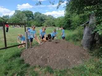 Nachmittags stand das nächste Highlight an. Traditionsgemäß pflanzt die Vorschulgruppe im Obstgarten einen Baum, in diesem Jahr war es eine Kirsche. Mit Schaufeln, Schubkarre, reichlich Erde und Wasser gelang es den fleißigen Kindern, mit Unterstützung ihrer Eltern den Baum in die Erde zu bringen.