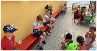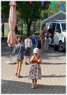 Heute am 11.07.2023 gab es eine tolle Überraschung für uns alle! Auf dem Hof stand ein Auto von unserem Essenanbieter Party Service Finke, mit einer Eismaschine drin.