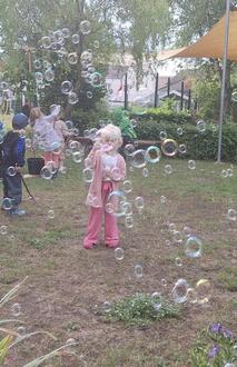 Am darauffolgenden Mittwoch fand unser beliebtes „Seifenblasenfest“ statt. Durch zwei gesponserte Seifenblasenmaschinen, schwebten dieses Jahr noch mehr bunte Blubberblasen durch unseren Garten. Aus Pfeifenreinigern und bunten Perlen bastelten die Kinder lustige Pustestäbchen für kleine Seifenblasen. An weiteren Stationen konnten Riesenseifenblasen und Schaumschlangen gepustet werden.